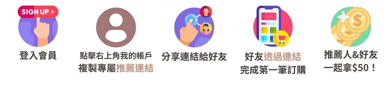 A1:首先登入或加入我們的會員,並點擊畫面右上角「我的帳戶」圖示(可參考上方截圖示意圖),進入我的帳戶後即可看到「會員推薦優惠」的連結,複製後分享給好友即可完成!